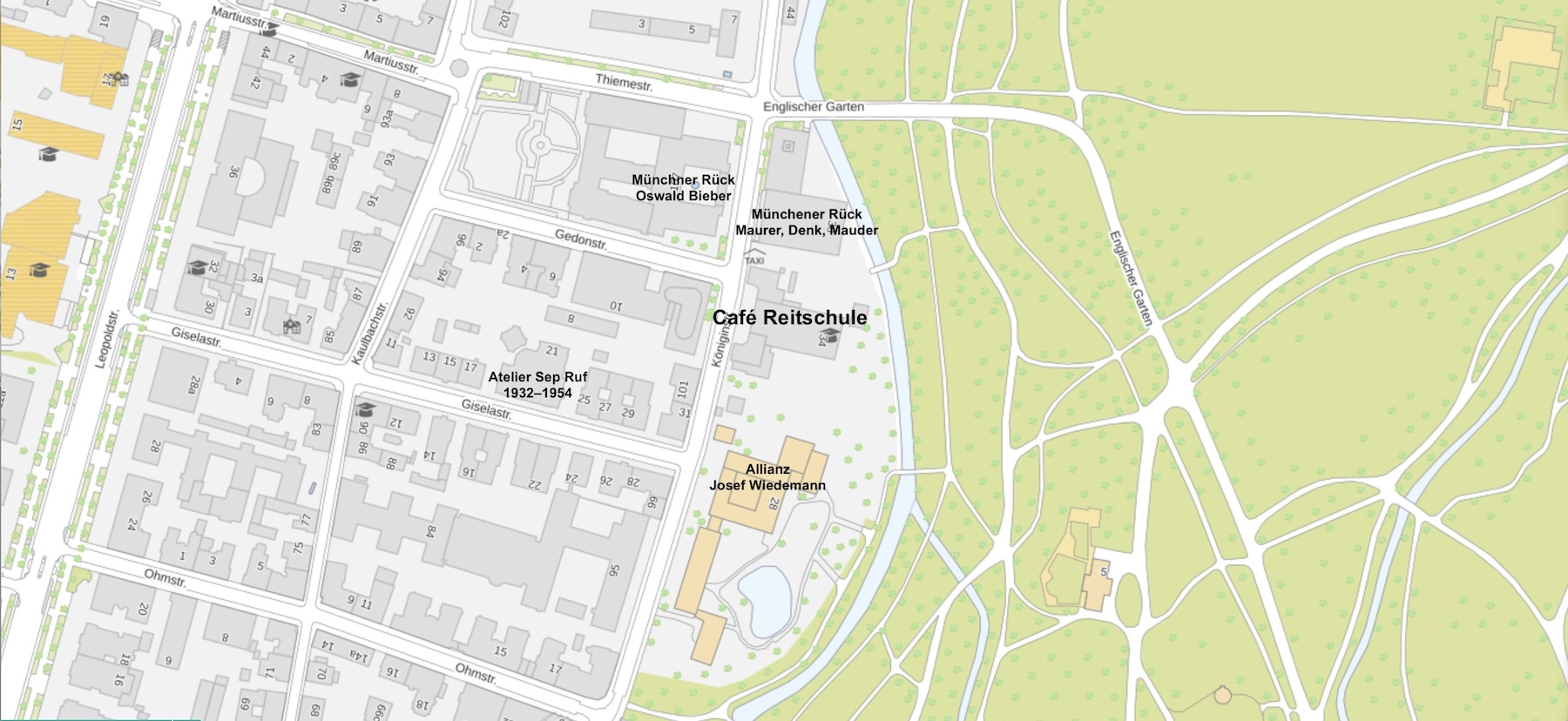 17.00 Uhr Rundgang (Treffpunkt vor dem Café Reitschule): Atelier Sep Ruf – Allianz, Josef Wiedemann – Münchener Rück, Maurer, Denk, Mauder